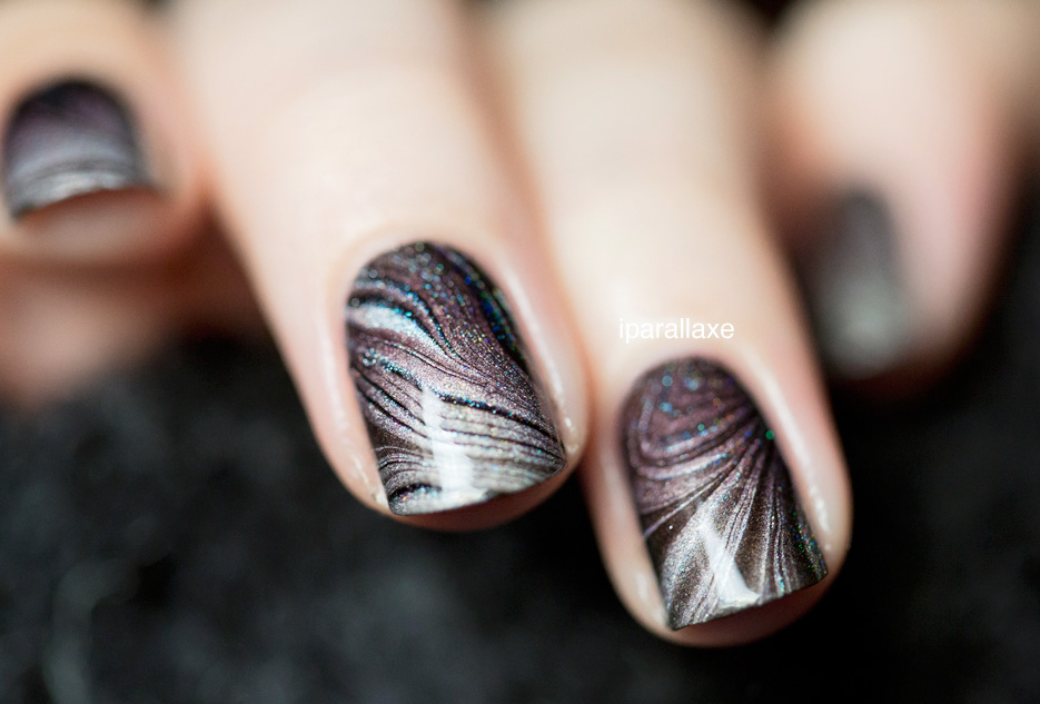 Je vous retrouve aujourd’hui avec un énièèèème watermarble. Dites-moi si je vous saoule avec cette technique, mais comme je la maîtrise de mieux en mieux, j’en profite ! De plus, l’utilisation de latex liquide autour de l’ongle me fait gagner un temps fou et rend la réalisation du NA tellement moins laborieuse…Et enfin, depuis que j’ai changé le blog de plateforme et que j’ai mis en place les différentes galeries de NA classés par technique, j’ai envie de les alimenter souvent et ça me motive pour nail-arter :)