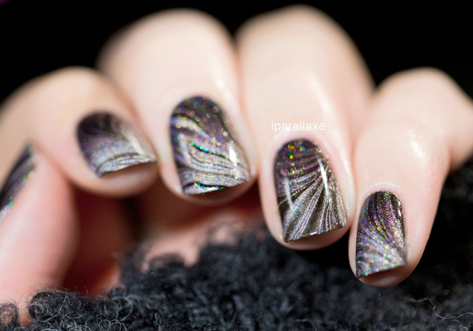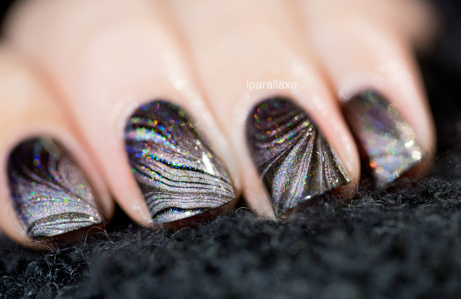 Le WM du jour est très simple (alternance de transparent, de Mega et de noir) mais je l’ai réalisé sur un gradient de A England Fonteyn et Sleeping Palace, de telle sorte qu’au final, on ne sait pas trop qui est qui, d’où viennent les particules holo et si c’est le watermable ou sa base qui est dégradé.